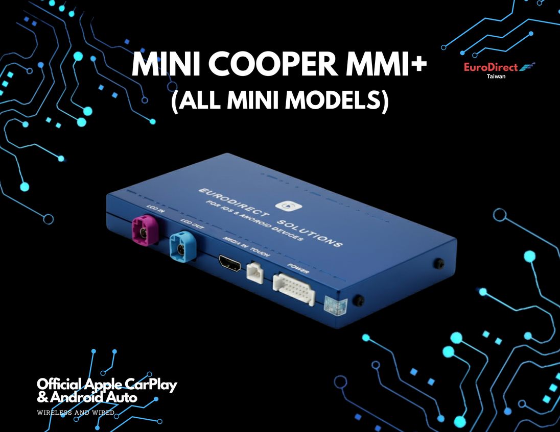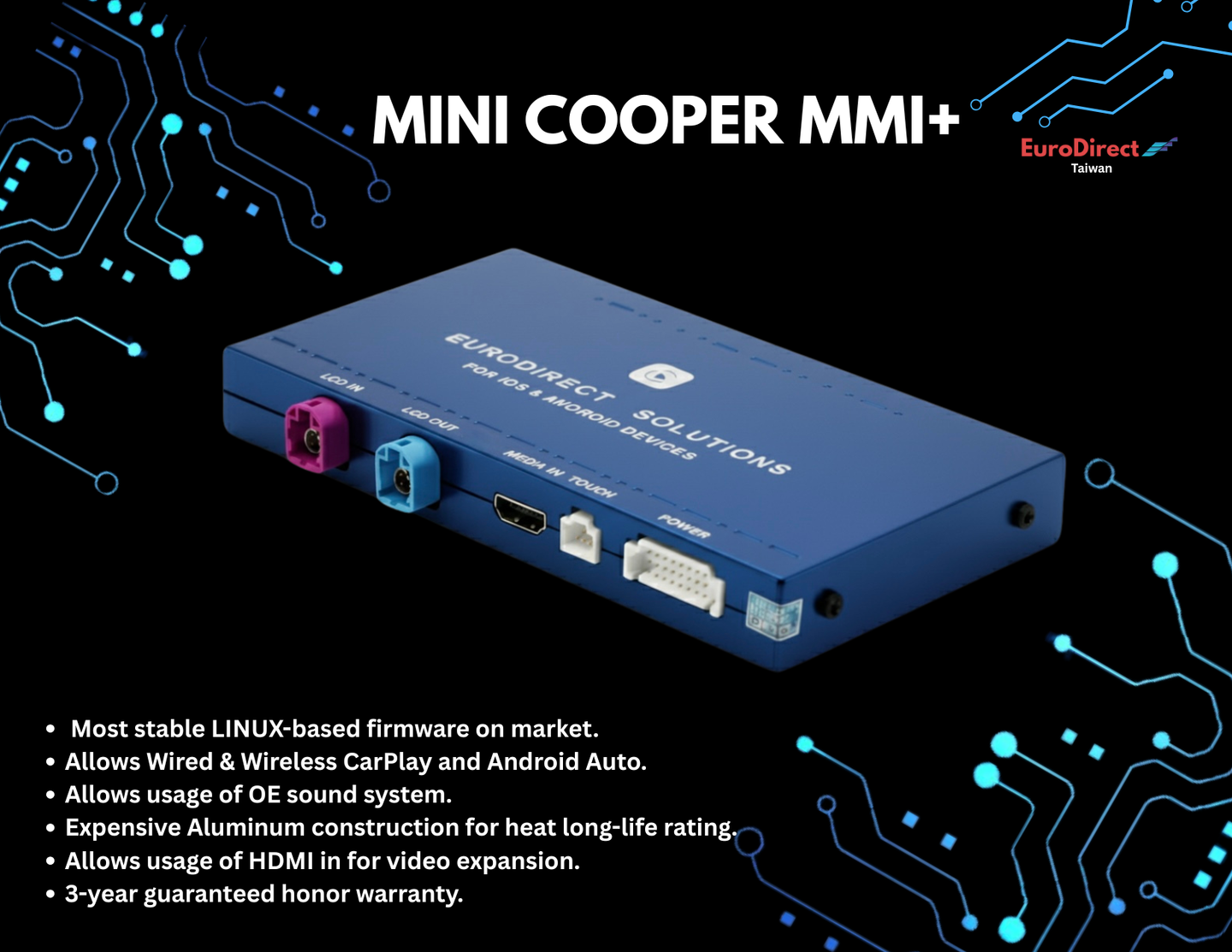 Add CarPlay/Android Auto to your Mini Cooper with the best MMI in the market. The BimmerDirect Taiwan MMI+ offers superior build quality, integration, performance and reliability. Our MMI Pro box connects to your existing screen and headunit.